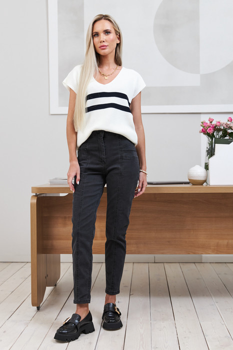 Брюки оригинального дизайна выполнены из качественного эластичного денима по классической джинсовой технологии (варка с эффектом легкого выбеливания). Высокая пасадка на талии. На передней части выполнены оригинальные карманы. Швы оформлены декоративными строчками. Застёжка на молнию-гульфик и пуговицу.