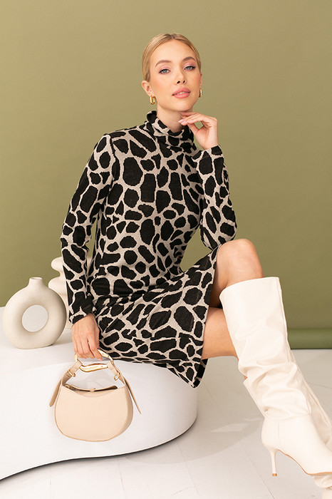Платье полуприлегающего силуэта из эластичного полотна с жаккардовым анималистичным узором. Втачной длинный рукав. Воротник-стойка с отворотом.