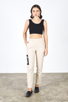 Брюки из эластичного полотна, с покрытием, имитирующим кожу, чуть зауженные книзу. По центру передней части брючин выполнен шов с декоративной строчкой. На задней части брюк накладные карманы. Пояс с эластичной резиной.