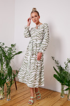 Платье свободного силуэта из вискозной плательной ткани. Изделие отрезное по линии талии, с ярусами на юбке. Лиф с застёжкой на пуговицы. Вырез горловины обработан воротником-стойкой. Втачной рукав в романтическом стиле, присборен на резинку. В комплекте пояс из основной ткани. В таблице размеров представлены параметры человека, а не изделия.