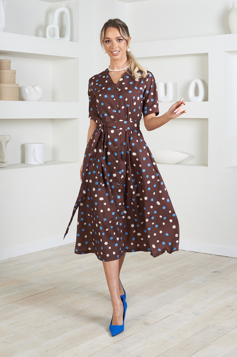 Платье из вискозной плательной ткани полуприлегающее в области груди и свободное в области бедер. Изделие отрезное по линии талии с застёжкой на пуговицы. В боковых швах карманы. V-образный вырез горловины, визуально делает фигуру стройнее. Втачной короткий рукав с защипами по низу рукава и манжетой. В комплекте пояс из основной ткани.