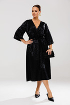 Платье свободного силуэта из плательной ткани. На передней части изделия выполнены декоративные рельефы и карманы. Втачной короткий рукав. Круглый вырез горловины, по среднему шву спинки застёжка на молнию.