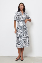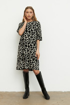 Платье из вискозной ткани с крэш-эффектом. Полуприлегающий силуэт, с разрезом в боковом шве. По среднему шву спинки застёжка на петлю-пуговицу. Круглый вырез горловины и линия проймы окантованы косыми бейками из основной ткани.