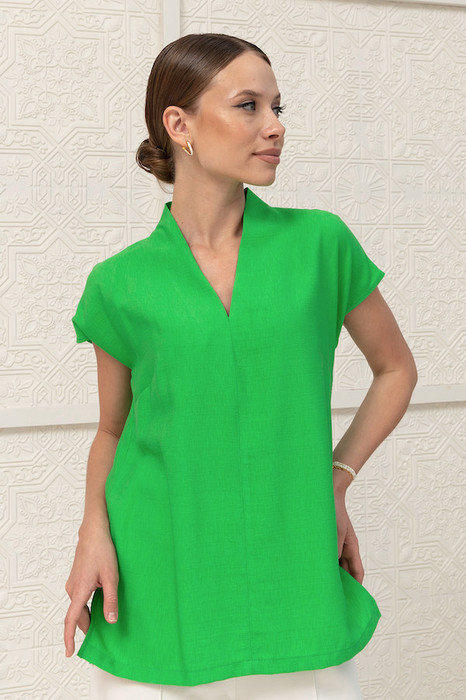 Блуза из вискозной ткани с крэш-эффектом. Свободный силуэт, с разрезами в боковых швах. По центру передней части изделия выполнен шов. Цельнокроеная стойка, переходящая в V-образный вырез горловины, визуально делает фигуру стройнее. Цельнокроеный короткий рукав.