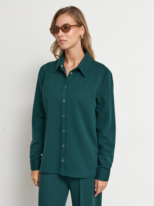 Жакет выполнен из эластичного полотна. Изделие в рубашечном стиле. Свободный силуэт с разрезами в боковых швах и застёжкой на планке. Вырез горловины обработан отложным воротником на стойке. Втачной рукав на манжете с застёжкой на кнопки.