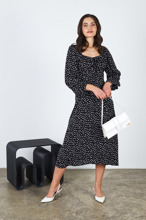 Платье приталенного силуэта, расширенное книзу из вискозной ткани. Отрезное по линии талии. Верхняя часть с отрезным лифом, подрез фигурный. По верхнему краю лифа кулиска, в которую вставлены бретели-завязки, формирующие драпировку. Вырез горловины глубокий, расширенный, по форме напоминающий каре, с вырезом до линии подреза. В верхней части среднего шва спинки застежка на потайную молнию. Рукава втачные, длинные, со сборкой по окату и низу рукава. В подгибку низа рукава вставлена резинка.