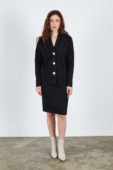 Костюм выполнен из эластичного полотна с жаккардовым узором "горох". Юбка прилегающего силуэта. Сзади по среднему шву небольшой разрез. Пояс с эластичной резиной. Кардиган свободного силуэта с притачной планкой и застёжкой на пуговицы. Втачной длинный рукав в спущенную пройму.