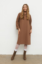 Платье свободного силуэта из вискозной ткани. Изделие по линии талии на резинке, на юбке-сборка. V-образный вырез горловины обработан отложным воротником на стойке. Втачной длинный рукав с манжетой, застегивающейся на пуговицы.