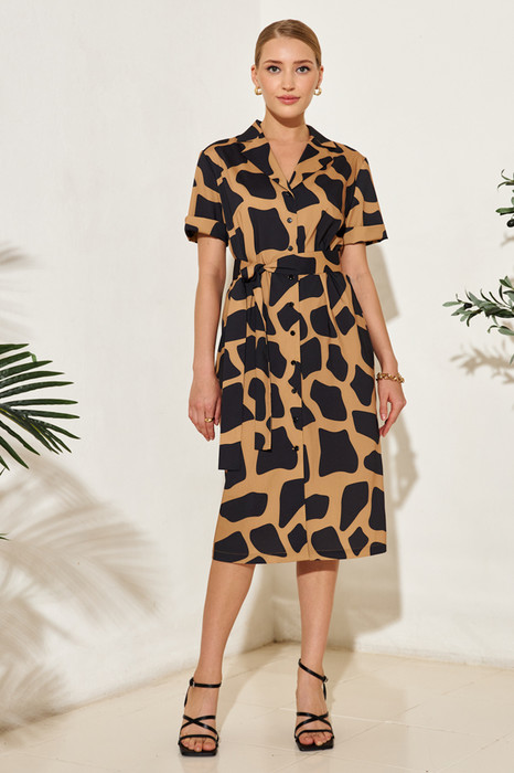 Платье из вискозной плательной ткани прямого силуэта с застёжкой на пуговицы. Втачной короткий рукав с отворотом. Вырез горловины оформлен английским воротником, который визуально сделает фигуру стройнее и подчеркнет красивую линию груди. В комплекте пояс из основной ткани.