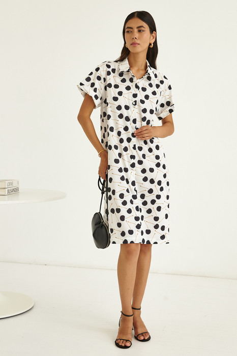 Платье-рубашка из вискозной плательной ткани. Свободный силуэт с застёжкой на пуговицы. Короткий рубашечный рукав с отворотом. Вырез горловины обработан отложным воротником на стойке. На задней части изделия выполнена кокетка с небольшой складкой. В комплекте пояс из основной ткани.