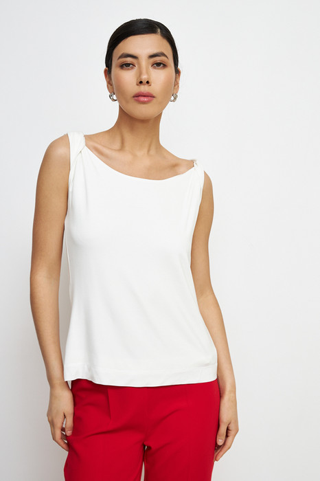 Джемпер полуприлегающего силуэта из вискозного эластичного полотна. Оригинальный крой с перекрутом на плечах. Изделие двухслойное с круглым вырезом горловины.
