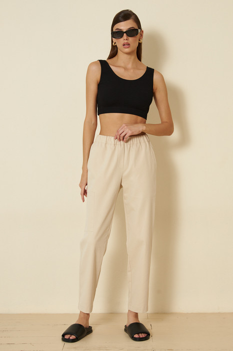 Брюки из хлопковой ткани, зауженные книзу. В боковых швах выполнены карманы с подкройным бочком. Пояс с эластичной резиной. На передней части брюк имитация гульфика, на бедре- карман.