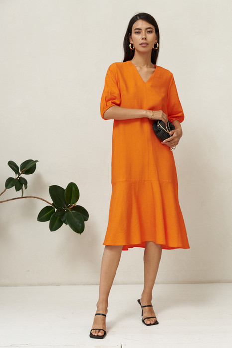 Платье свободного силуэта из вискозной ткани с крэш-эффектом. По центру передней части изделия и спинки выполнен шов. Цельнокроеная стойка, переходящая в V-образный вырез горловины, визуально делает фигуру стройнее. Втачной короткий рукав, по низу рукава сборка на резину. Низ изделия украшен широким воланом.