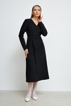 Платье из эластичного полотна. Изделие свободное в верхней части и прилегающее в области талии и бёдер. Лиф изделия оригинального кроя в стиле кимоно. Цельнокроеная стойка переходящая в запах, визуально делает фигуру стройнее. По центру задней части платья выполнен шов, снизу небольшой разрез. В комплекте пояс. В таблице размеров представлены параметры человека, а не изделия.