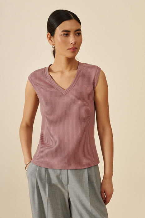 Джемпер прилегающего силуэта из эластичного полотна в рубчик. V-образный вырез горловины и линия проймы оформлены бейками.