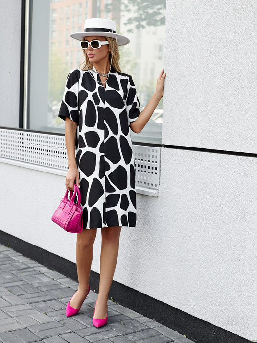 Платье свободного силуэта из плательной ткани. По центру передней части изделия выполнен шов. Цельнокроеная стойка, переходящая в V-образный вырез горловины, визуально делает фигуру стройнее. Втачной короткий рукав.
