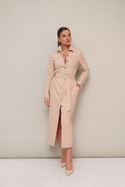 Платье свободного силуэта из фактурного эластичного полотна. V-образный вырез горловины обработан притачной планкой. Втачной длинный рукав в спущенную пройму с манжетой.