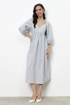 Платье свободного силуэта из хлопковой ткани. Изделие отрезное по линии талии. Линия талия завышена и фигурная. Верхняя часть юбки со сборкой. По среднему шву спинки потайная молния. Лиф переда и спинки двухслойный, имеет рельефные швы. Окат рукава и низ рукава зафиксированы резиной.