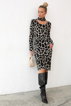 Платье прилегающего силуэта из вискозной ткани с вытканным жаккардовым узором "рептилия". Крой платья по косой. Втачной длинный рукав. Круглый вырез горловины, сзади застёжка на петлю-пуговицу.