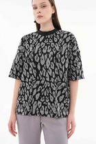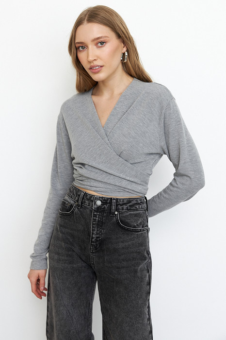Джемпер свободного силуэта из меланжевого эластичного полотна. На детали полочки цельнокроеные длинные завязки. Вырез глубокий, V-образный. Втачной рукав в спущенную пройму. Длина джемпера до линии талии.