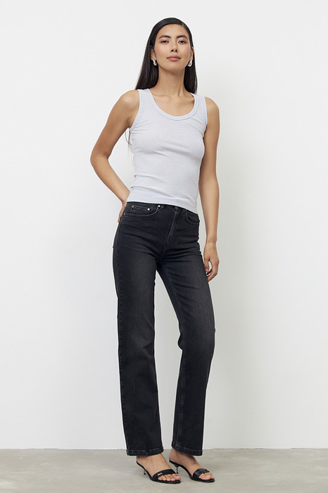 Брюки из эластичного денима, выполнены по классической джинсовой технологии (варка с эффектом легкого выбеливания). Прямой классический крой. На задней части брюк выполнены накладные карманы, на передней - карманы с подкройным бочком. Притачной пояс со шлёвками. Застёжка на молнию-гульфик и пуговицу.