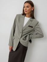 Жакет полуприлегающего силуэта из костюмной ткани. Изделие с английским воротником и застежкой на пуговицу. На передней части жакета выполнен нагрудный карман с листочкой и карманы в рамку с клапаном. По центру задней части выполнена шлица - элемент декоративный и необходимый. Обеспечивает свободу движения, добавляет шику и элегантности. Втачной длинный рукав, снизу имитация шлицы с пуговицами. Изделие идеально держит форму, имеет четкую линию плеча благодаря плечевым накладкам. Жакет на подкладке.