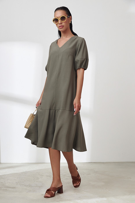 Платье свободного силуэта из вискозной ткани с крэш-эффектом. По центру передней части изделия и спинки выполнен шов. Цельнокроеная стойка, переходящая в V-образный вырез горловины, визуально делает фигуру стройнее. Втачной короткий рукав, по низу рукава сборка на резину. Низ изделия украшен широким воланом.