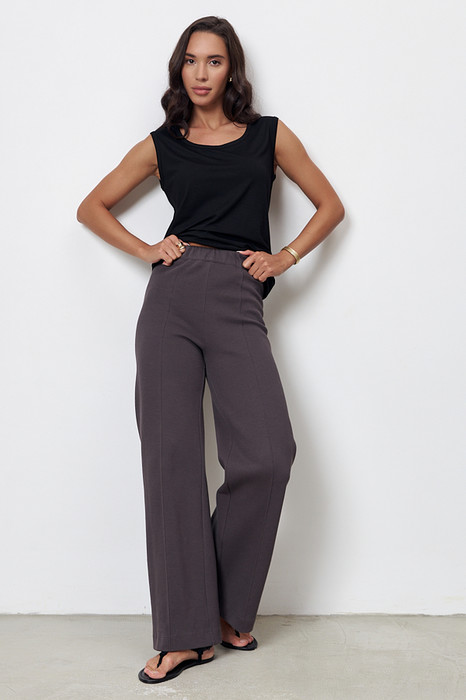 Брюки из эластичного полотна прямого силуэта. Пояс с эластичной резиной. На передней части брюк застрочены стрелки.