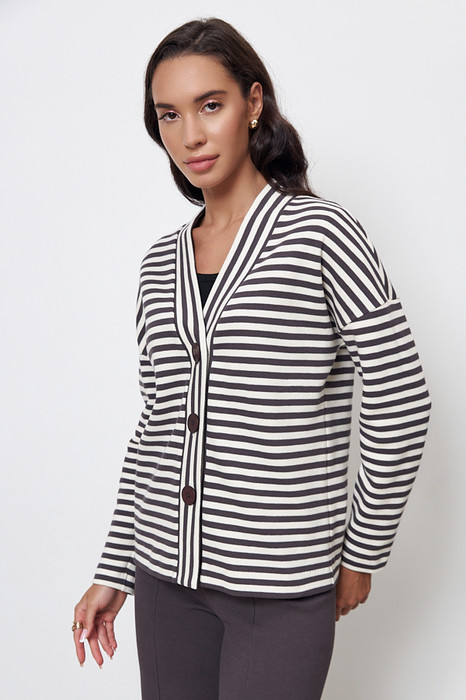 Кардиган из эластичного полотна свободного силуэта. Втачной длинный рукав в спущенную пройму. Линия борта обработана притачной планкой с застёжкой на пуговицы.
