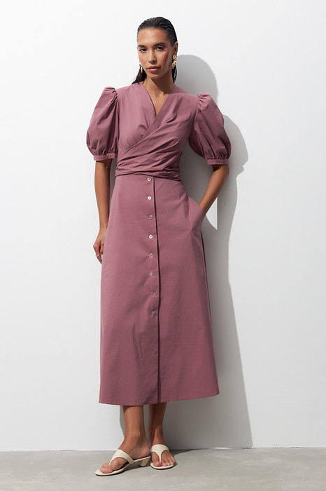 Платье из хлопковой ткани отрезное по линии талии. Изделие прилегающего силуэта в области груди и свободного кроя в области бёдер, с карманами в боковых швах. Линия талии завышена. На полочке нагрудная вытачка переведена в широкий цельнокроеный пояс, завязывающийся сзади. На спинке — талиевые вытачки. Глубокий V-образный вырез горловины. Застёжка на пуговицы в нижней части платья. Рукав втачной, собран по окату и по низу рукава в густую сборку. Низ рукава обработан манжетой.