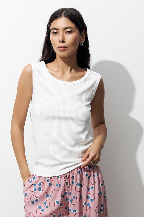 Топ из эластичного полотна в рубчик. Полуприлегающий силуэт. Линия горловины и линия проймы окантованы эластичной бейкой.