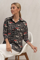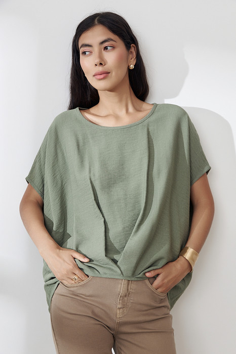 Блуза из вискозной ткани с крэш-эффектом. Свободный крой асимметричной длины (спинка удлинена относительно переда). Спущенное плечо. Линия проймы, линия горловина и низ изделия окантованы косой бейкой из основной ткани. Изюминкой являются оригинальные складки на передней и задней части изделия.