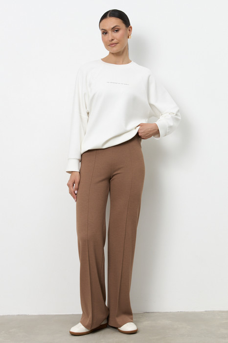 Брюки прямого силуэта из эластичного полотна. Пояс с эластичной резиной. На передней части брюк застрочены стрелки.