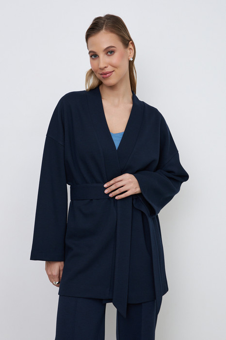 Кардиган из эластичного полотна свободного силуэта с притачной планкой. Втачной широкий рукав в спущенную пройму. В комплекте пояс, позволяющий создавать приталенный силуэт.