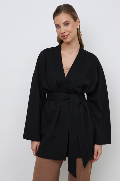 Кардиган из эластичного полотна свободного силуэта с притачной планкой. Втачной широкий рукав в спущенную пройму. В комплекте пояс, позволяющий создавать приталенный силуэт.
