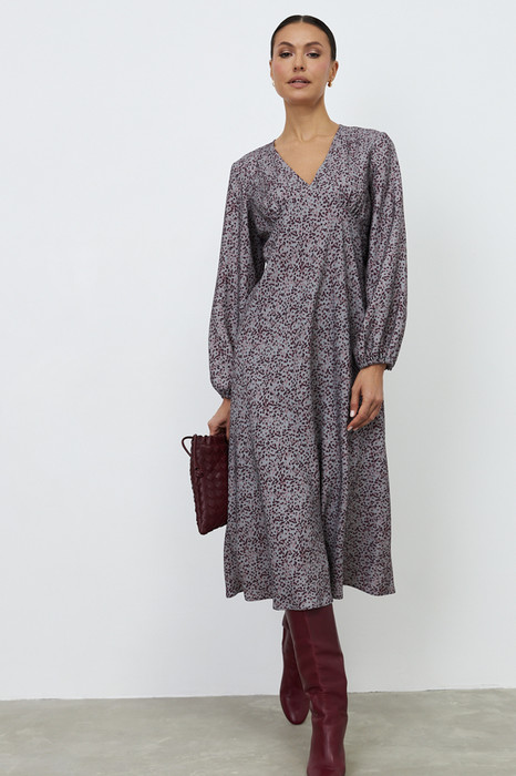 Платье из вискозной ткани полуприлегающего силуэта, расширенное книзу. Крой платья-по косой. На передней части изделия выполнен фигурный подрез в области груди, со сборкой. V-образный вырез горловины оформлен косой бейкой. Втачной длинный рукав, по низу рукава сборка на резину.