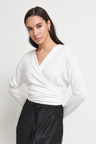 Джемпер свободного силуэта со спущенной линией плеча и рукавом до локтя выполнен из эластичного полотна. Вырез горловины оформлен подвязом. В таблице размеров представлены параметры человека, а не изделия.