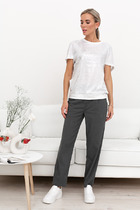 Костюм из эластичного полотна. Брюки прямого силуэта. Пояс с эластичной резиной. Кардиган свободного силуэта с притачной планкой. Втачной широкий рукав в спущенную пройму. В комплекте пояс из основной ткани.