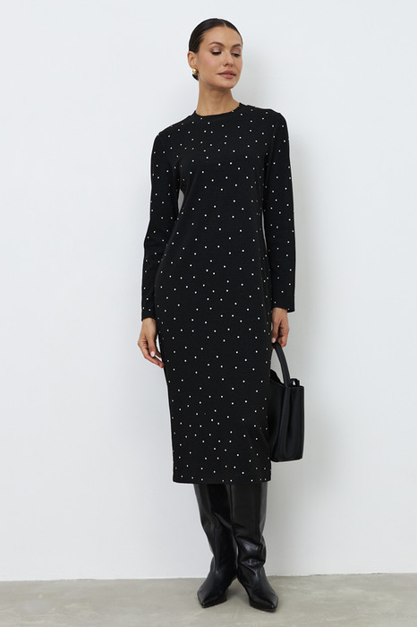 Платье полуприлегающего силуэта из эластичного полотна. Круглый вырез горловины оформлен притачной бейкой. Втачной длинный рукав.