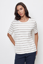 Джемпер свободного силуэта со спущенной линией плеча и рукавом до локтя выполнен из эластичного полотна. Круглый вырез горловины. В таблице размеров представлены параметры человека, а не изделия.
