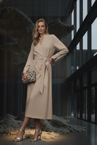 Платье из плательной ткани. Свободный силуэт, слегка прилегающий в области бедра. По спинке изделия выполнена застёжка на декоративные пуговицы, снизу-разрез. Цельнокроеный рукав 3/4. Круглый вырез горловины. В комплекте пояс, позволяющий создавать приталенный силуэт.