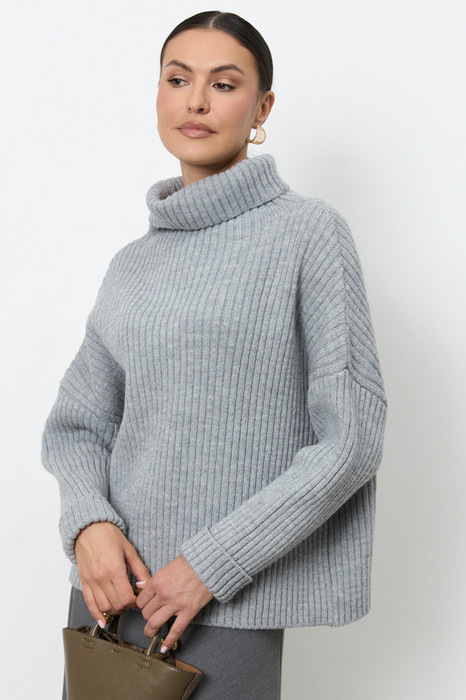 Джемпер свободного силуэта со спущенной линией плеча и длинным рукавом. Линия горловины оформлена высокой стойкой. Изделие выполнено из мягкой пряжи.