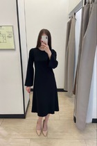 Платье из плательной ткани. Изделие прилегающего силуэта, крой платья по косой. Втачной длинный рукав. Круглый вырез горловины, сзади застёжка на петлю-пуговицу.