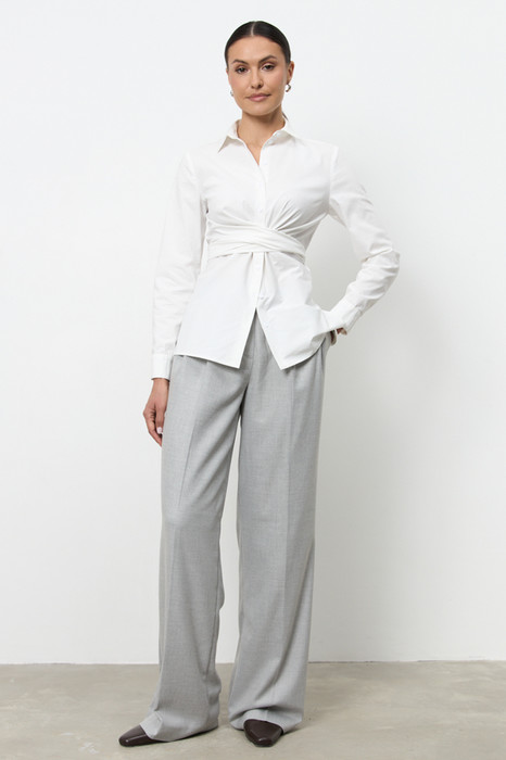 Брюки свободного силуэта из меланжевой костюмной ткани. На передней половинке выполнены карманы с подкройным бочком, по линии талии заложены складки. На задней половинке - талиевые вытачки и имитация карманов в рамку. Притачной пояс со шлёвками. Застёжка на молнию-гульфик и пуговицу. Такой крой выгодно подчеркнёт длину ваших ног.