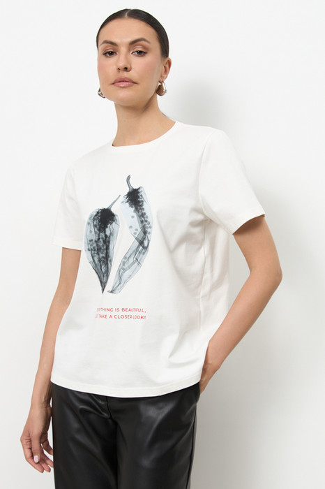 Джемпер свободного силуэта из хлопкового эластичного полотна. Втачной короткий рукав. Круглый вырез горловины оформлен бейкой.