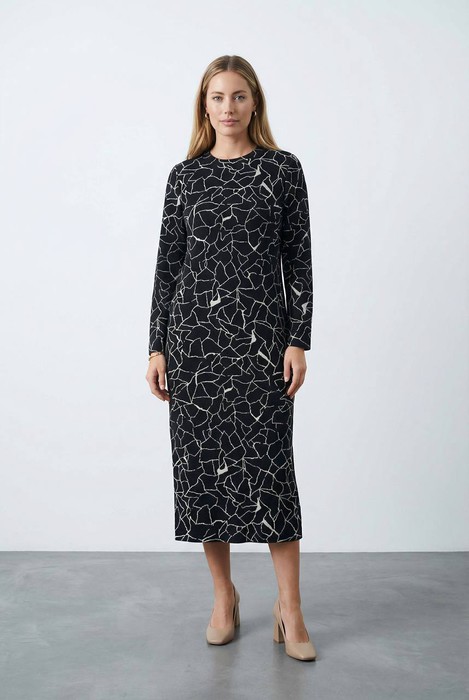 Платье полуприлегающего силуэта из эластичного полотна. Круглый вырез горловины оформлен притачной бейкой. Втачной длинный рукав.