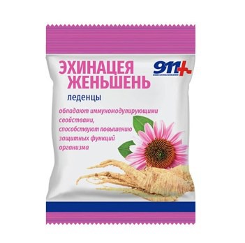 Леденцы ЭХИНАЦЕЯ, ЖЕНЬШЕНЬ с витамином С. Леденцы способствуют повышению защитных функций организма, обладают иммуномодулирующими свойствами. Энергетическая ценность на 100 г: 970 кДж/230 Ккал. Пищевая ценность (на 100 г): белки 0 г, жиры 0 г, углеводы 97 г (из них сахароспиртов 96,8 г). Содержание в рекомендованной дозе 5 шт. леденцов, Витамин С 35  мг Гидроксикоричные кислоты 1,7  мг Гинсенозиды 1,75  мг Суточная норма потребления сахароспиртов не более 50 г. В 100 г продукта содержится 96,8 г сахароспиртов, в суточной дозе продукта (5 леденцов по 2,5 г) - 12,2 г. Состав изомальт (подсластитель), мальтитный сироп (подсластитель), лимонная кислота (антиокислитель), экстракт эхинацеи пурпурной, экстракт женьшеня обыкновенного, аскорбиновая кислота (витамин С- L-аскорбиновая кислота), куркумин (краситель). Содержит подсластители. При чрезмерном употреблении может оказывать слабительное действие. Показания в качестве биологически активной добавки к пище - источника гидроксикоричных кислот, гинсенозидов, дополнительного источника витамина С. Противопоказания индивидуальная непереносимость компонентов, беременность и кормление грудью, склонность к расстройству функций кишечника. Перед применением рекомендуется проконсультироваться с врачом. Способ применения и дозы Взрослым по 5 леденцов в течение дня непосредственно после приемов пищи, рассасывая во рту до полного растворения. Продолжительность приёма 2 недели. При необходимости прием можно повторить. Не является лекарственным средством.