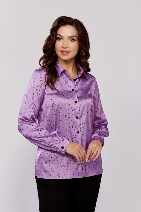 Блузка женская прямого силуэта на центральной застежке на петли и пуговицы. Перед с нагрудными вытачками от боковых швов. Спинка цельнокроеная. Рукав втачной одношовный длинный по низу со сборкой и на манжете, застегивающемся на петлю и пуговицу. Горловина на стойке с воротником.