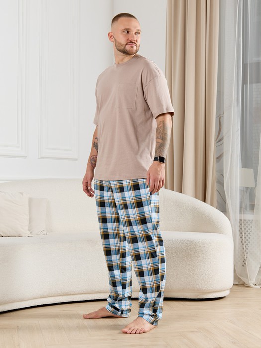 Брюки мужские из трикотажного полотна "кулирка" в клетку, свободного покроя, на притачном поясе с эластичной тесьмой внутри, с карманами в боковых швах. Нижние срезы обработаны подгибкой.