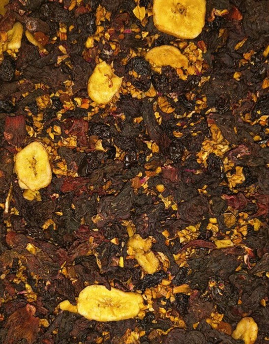 Каркадэ, яблоки, груша, папайя, изюм, банан, календула, лист клубники, лепестки роз, ароматические масла